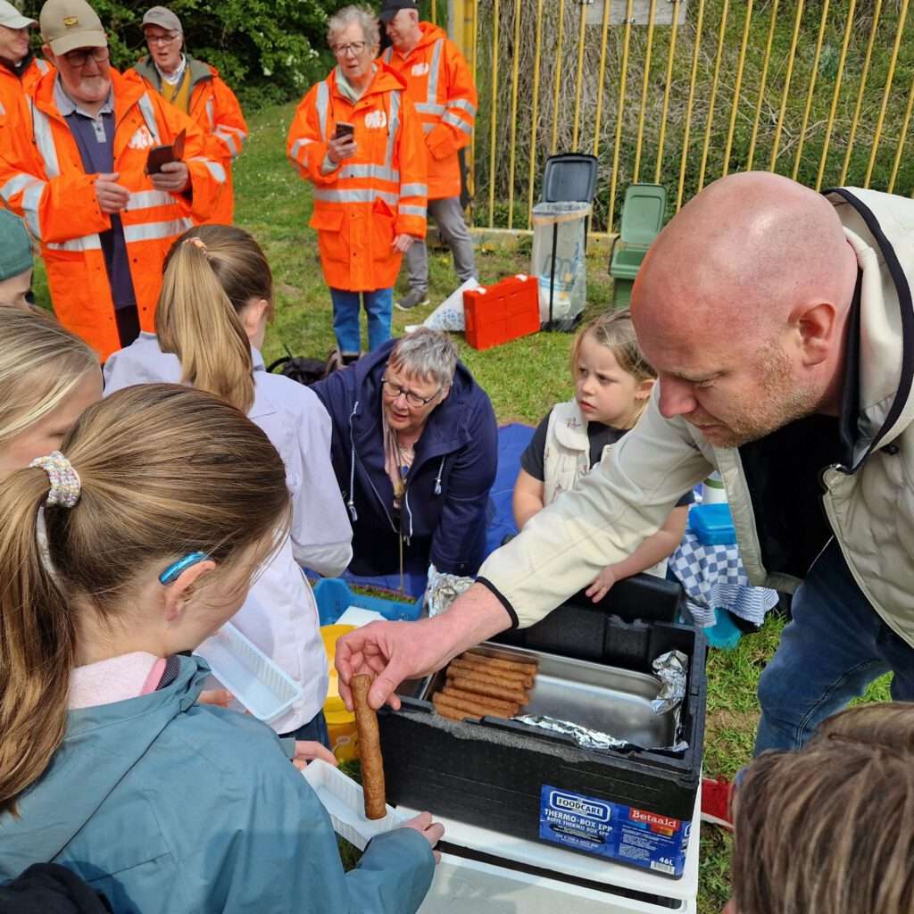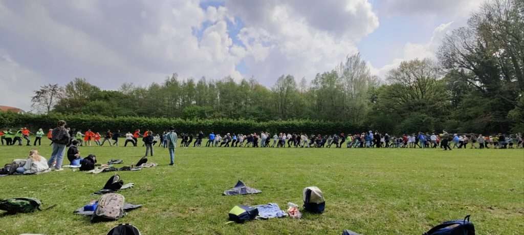 Vandaag begonnen we de dag onder een koud zonnetje. Alle kinderen stonden weer fris en fruitig aan de start voor de 2e wandeldag. We vertrokken via het “dellengebied” naar Houthem waar we op het grote grasveld van Camping Geul en Bos de grote pauze hielden. Deze dag was qua kaartlezen wat uitdagender dan gisteren waardoor sommige groepen extra wat meters hebben gemaakt 😉. Via de kleine pauze bij de Nachtegaal (kleine groepen) en de Curfsgroeve (grote groepen) liepen we via bruggetjes en langs de Geul naar de Camping. Bij het betreden van het grasveld kreeg iedereen een flesje water van Plus Quaedvlieg. Opeens begonnen sommige kinderen in het rond te kijken omdat hun neuzen iets hadden opgevangen…….het waren de 200(!) frikandellen waar Bram van de gelijknamige Gastrobar mee kwam aan lopen. Opeens bleek het totaal niet meer moeilijk om 127 kinderen stil en in het gareel te krijgen om deze snack op te halen. Samen met een emmer (letterlijk!) heerlijke mayonaise én huisgemaakte satésaus van Antoine werden deze snacks binnen no-time verorberd. Wie denkt dat dit alles even tijd nodig had om te verteren heeft het mis! Toen de voetballen en touwen werden uitgedeeld ging het los. Gelukkig hadden we een enorm terrein tot onze beschikking want ons touw voor het touwtrekken was zeker 50m lang. Dat was ook nodig want al snel werd er een heuse touwtrek wedstrijd georganiseerd. De meisjes tegen de jongens. Gezien de verdeling tussen meisjes en jongens zou dit een gelijkwaardige strijd kunnen worden. Na flink wat oerkreten en uiterste inspanningen waren het de jongens die nipt wonnen. Dit lieten de dames natuurlijk niet op zich zitten en dus kwam er een revenge……met een twist. De leiding werd uitgedaagd door de deelnemers. 127 kinderen aan één kant en aan de andere kant 30 uitbuikende volwassenen die net een warme frikandel met een flinke klodder mayonaise achter de kiezen hadden. Was dit wel eerlijk? Natuurlijk niet! De kinderen wonnen dan ook met grote overmacht 💪🏻. Daarna werd er nog uitbundig gevoet- en gevolleybald. Na een wat langere pauze moesten we toch echt weer terug naar Amby. We liepen langs het spoor (op ruime afstand 😅) naar Meerssen en volgden de Geul naar Rothem. We kwamen rond 15:00uur weer aan op het Severenplein. We zijn op de helft! Woensdag is het weer tijd voor de zonnebrand en de petjes. Denkt u ook aan de tekencheck?